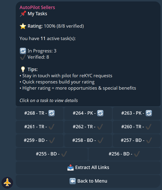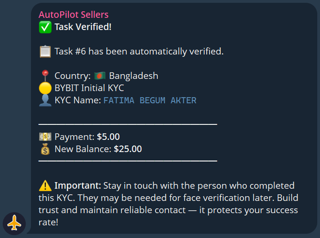 AutoPilot Seller is a Telegram bot that connects you with orders for KYC verification. You receive a task link, complete the identity verification on the exchange, and get paid automatically.