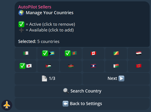 You can set which countries you want to work with in the bot settings. This filters the tasks you receive — only orders from your selected countries will be shown to you.