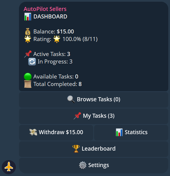 Access your dashboard anytime via the My Dashboard button in the bot. It shows your current balance, active tasks, completed task count, and your rating.