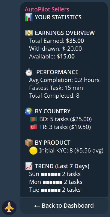 The bot provides detailed stats on your performance: total tasks completed, success rate, total earned, average completion time, and country breakdown.
